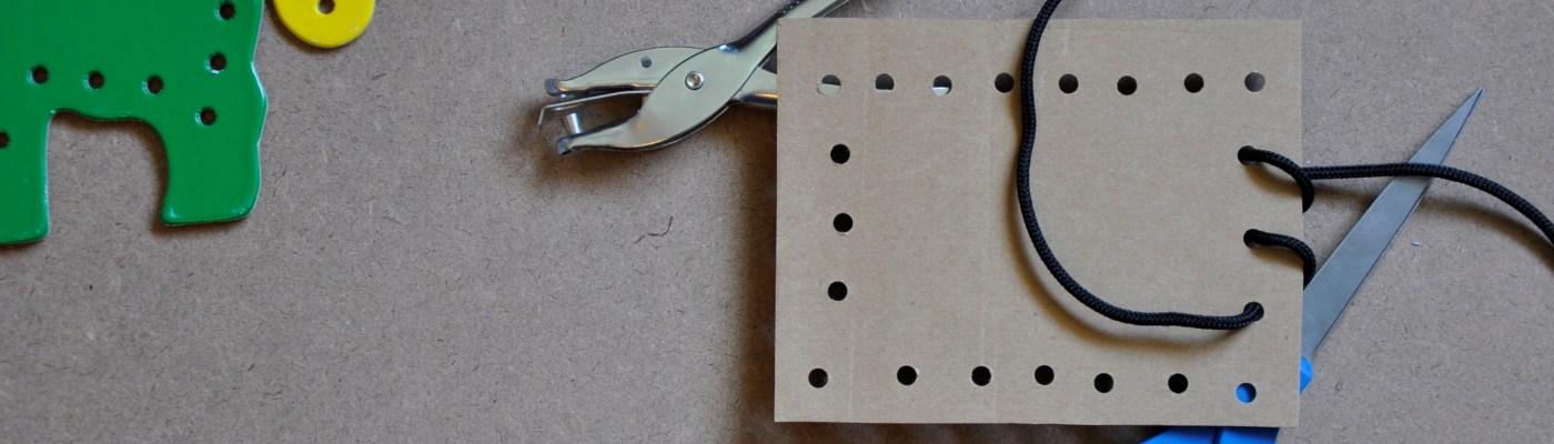I made the one above in no time, literally – maybe 3 minutes, it took longer to find the supplies then to make it. Just cut cardboard into a shape, punch, and get laces. You could even use yarn with the end wrapped in tape if you don’t have laces.