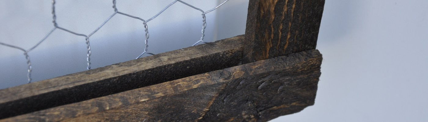 This card display is made from lath strips, 4 to be precise. The lath strips are 4 feet long. I took 2 of the strips and cut them in half, leaving me with 4 – 2 foot pieces and 2 – 4 foot pieces. I lined them up and sandwiched the 4ft piece between the 2 foot pieces at the end. Then taking my handy-dandy nail gun (I really do love it!), nailed them together. Once the frame was together I stained it, let the stain dry them stapled chicken wire to the back. The good thing was I used 2 foot chicken wire, I measured it out 4 foot and cut. Only one cut – which was nice because working with chicken wire can be a pain.