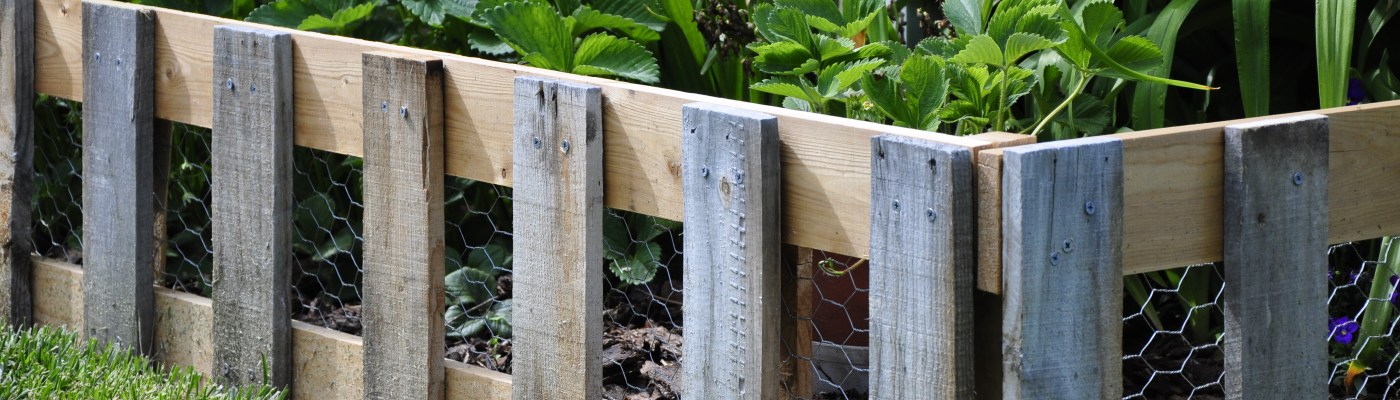 I cut the pieces to the needed size and then laid them out. The rungs I eyed where they went, but there is around 4 inches between each one. Then once I was happy about how it looked, I screwed them together. To keep the piece upright I used longer pallet slats and pounded them into the ground – behind one of the rungs (so you can’t see them) and attached it to the edge. And it was done. The nice thing is that it cost less than $20 for 15 feet!