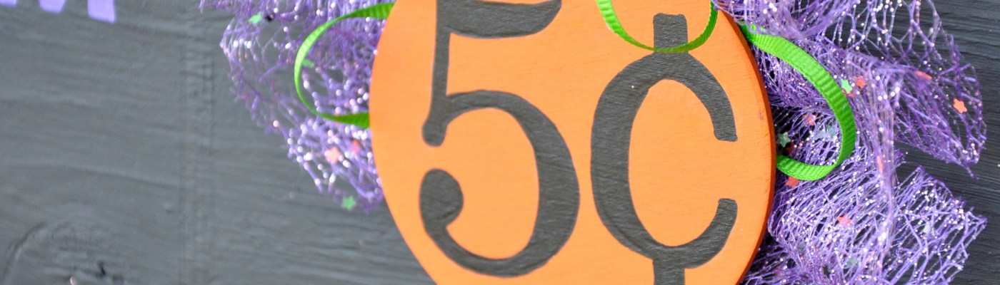 I then took purple and orange paint markers and outlined and filled in the letters on the sign and used black to fill in the 5 and cent sign on the orange circle. After everything was dry, I used orange ribbon and hot glued it along the edge to finish off the side of the sign. I then took 3 small circle and glued them onto the sign, this will be the base of the orange circle. While the glue was drying, I took a 12-inch piece of purple Halloween tulle and 1/4-inch green ribbon and positioned them so that just an edge of the tulle would be seen with the green ribbon over it. I then glued the orange circle on top of the other circles.