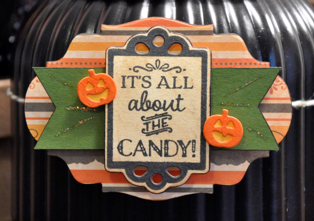 - Using foam dots, attach the It’s all about the candy die cut and attach the 2 orange jack-o’-lanterns.