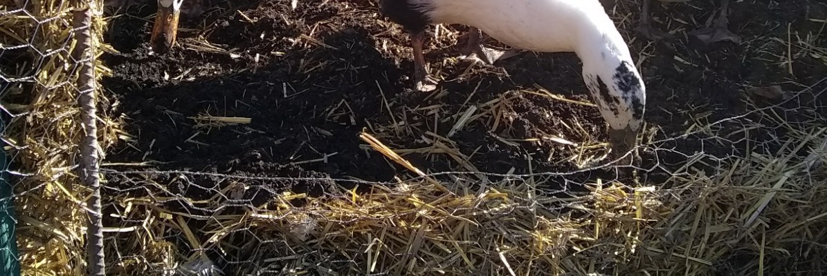 Anyway, the idea is fairly simple for these garden beds. I use the straw that we have in our duck house and run for these. It’s a lot – approximately 10 bales. And since the straw that is in the duck house spent all winter collecting the ducks poop, which is high in nitrogen, it had already started to decompose (which is great because as it started to decompose it heats up a little, which gives the ducks a little heat in the winter). I clean out the duck house and run and place all the straw into an already made bed. After everything was cleaned out, I went back with a good layer of bone meal mixed with wood ash. And gave it a good watering. I also use these for regular compost bins. I just use a hand rake to pull some of the straw back and dump in the compost – cover it back up and go on with my day. I did this the other day and it was already decomposing nicely, and just since I made them they have actually shrank (i.e. compacted) to about half of what they were.