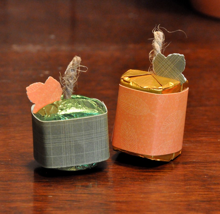 The first are these adorable favors. Both are made the same way, the small green one is 2 Dove chocolates and the large one is Hersheys chocolates. I started by gluing them together with glue dots – I added a piece of jute cord between them for the stem. Then wrapped them in patterned paper. I then used the leave punch from the Stampin’Up Every season punch pack and cut 2 leaves per favor and glued them together and placed them between the candies.