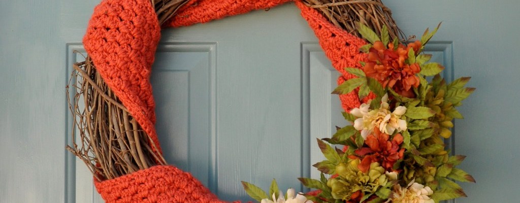 I started with a grapevine wreath and a six-foot-long crocheted scarf (I had made the scarf a while back as one of my very first crochet projects). If you wanted to recreate the look but don’t crochet, you can use a store-bought scarf, or a piece of fabric. I wrapped the scarf around the wreath and secured the ends at the same point. I then added faux flowers.