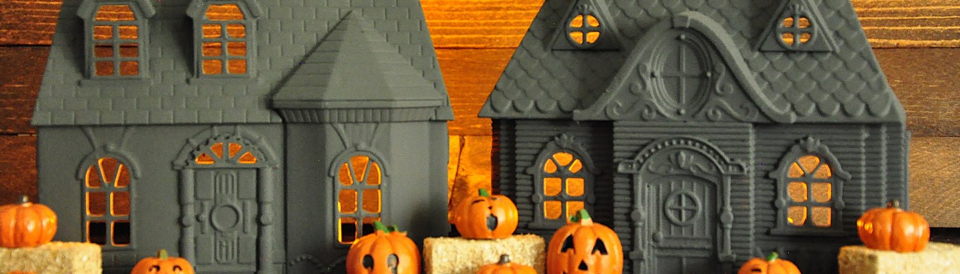 A few weeks ago, I shared my Fall Village with you. They are adorable little houses that I found at the dollar store and painted in fall colors. Well, today, I thought I would share the ‘Halloween version’ of them.