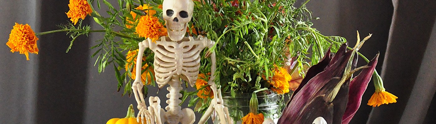 Doesn’t this little guy look happy! He’s just hanging out with his pumpkin on a metal spiderweb cake stand. The black cauldron is a new addition to our Halloween decor, I was able to find it, and the little skeletons at Michaels.